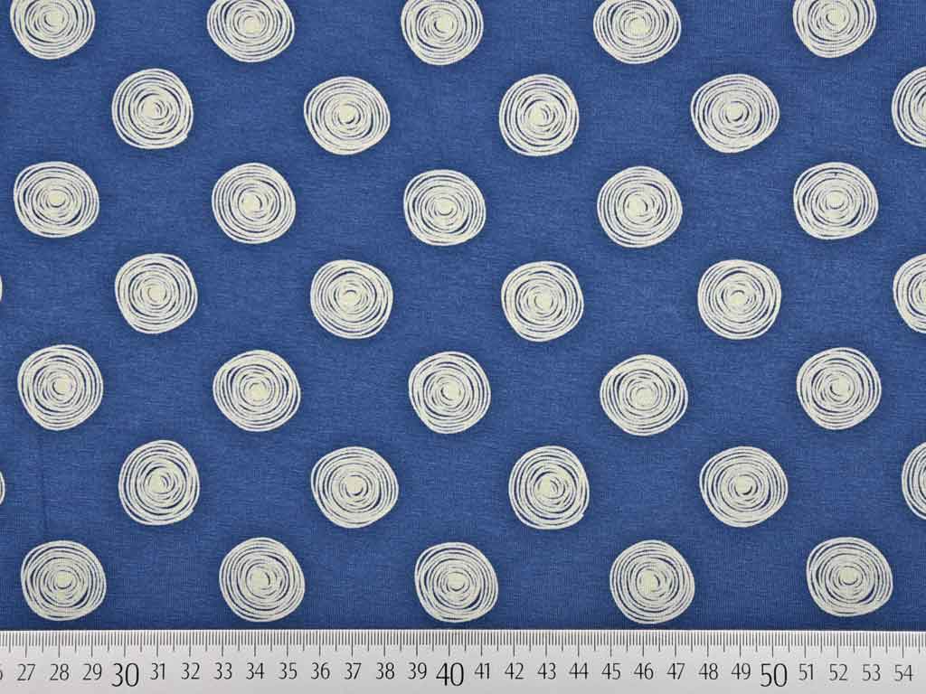 Ein weich fließender Viskose Jersey in jeansblau mit cremefarbenen Kringeln.