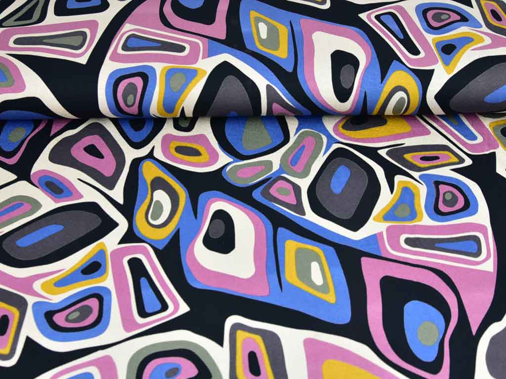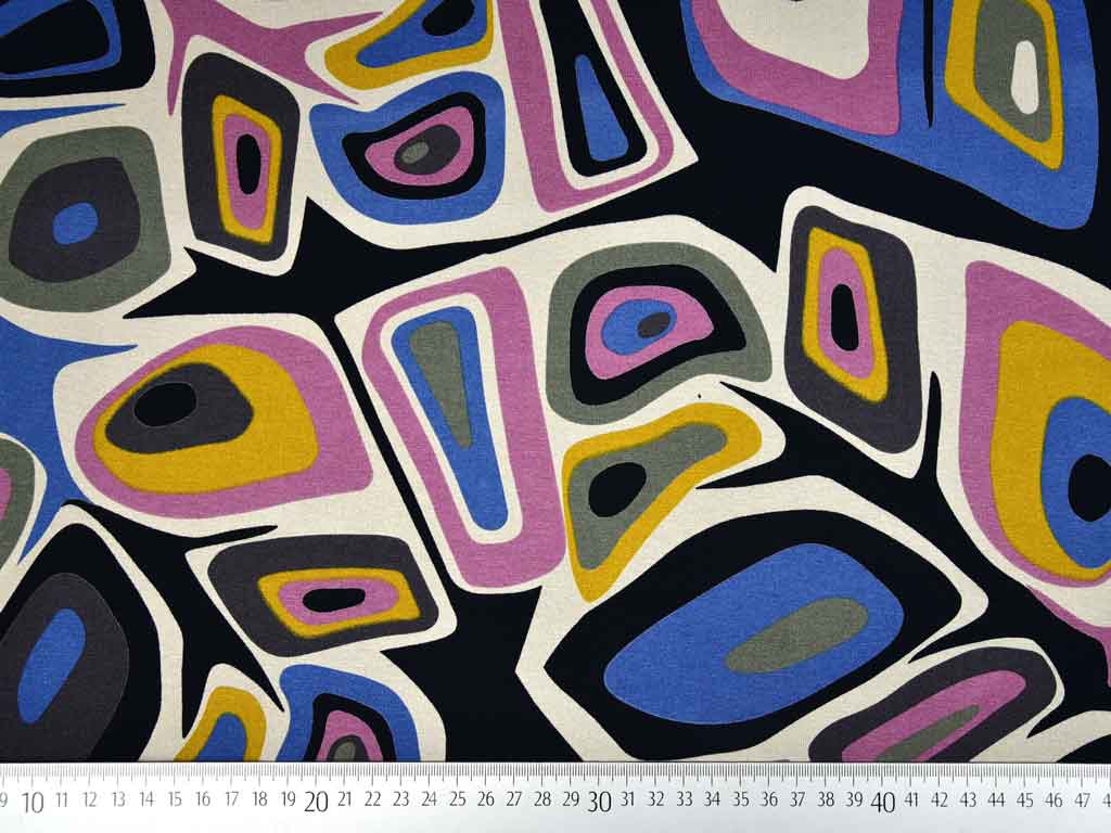 Ein weich fließender Viskose Jersey in schwarz mit bunten geometrischen Formen im Stil der 70er Jahre. Das Muster ist blau, beige, ocker, khaki und altrosa.