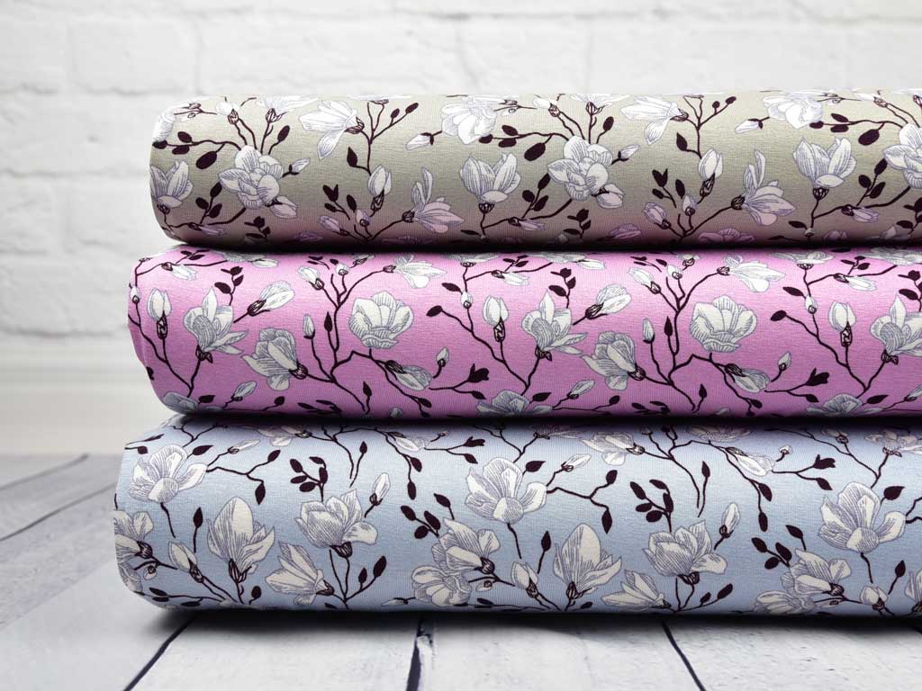 Ein weicher und luftiger Viskosejersey in taupe mit weiß-hellgrauen Blumen und weinroten Ranken.