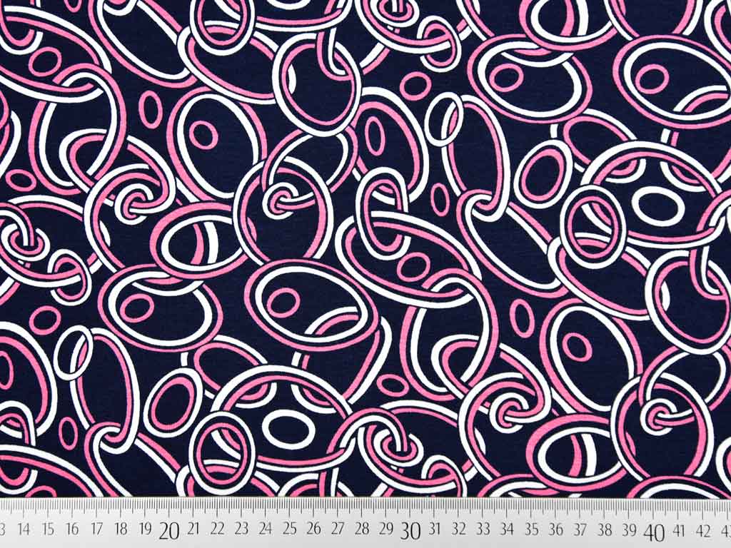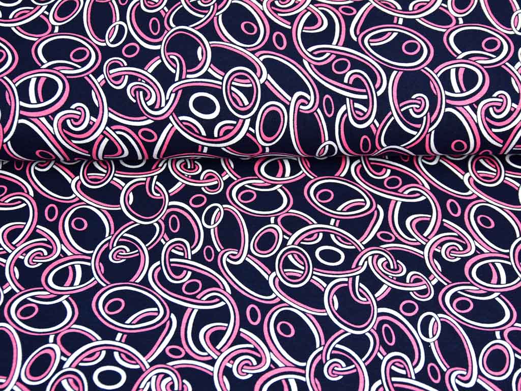 Ein dunkelblauer Viskose Jersey mit verschiedenen pinken und weißen Kreisen, die an Ketten erinnern. Der Stoff fällt fließend weich.
