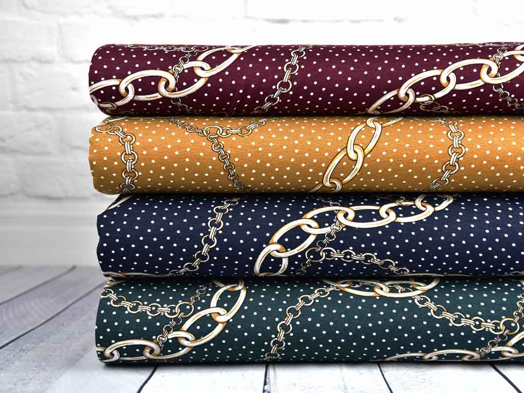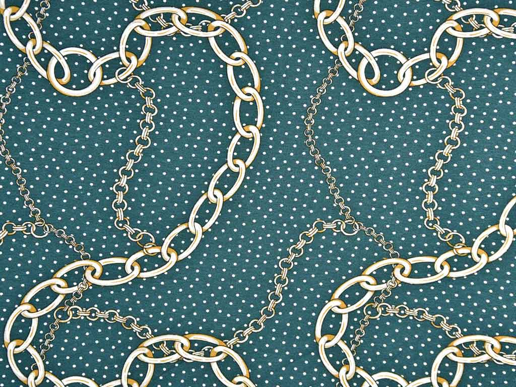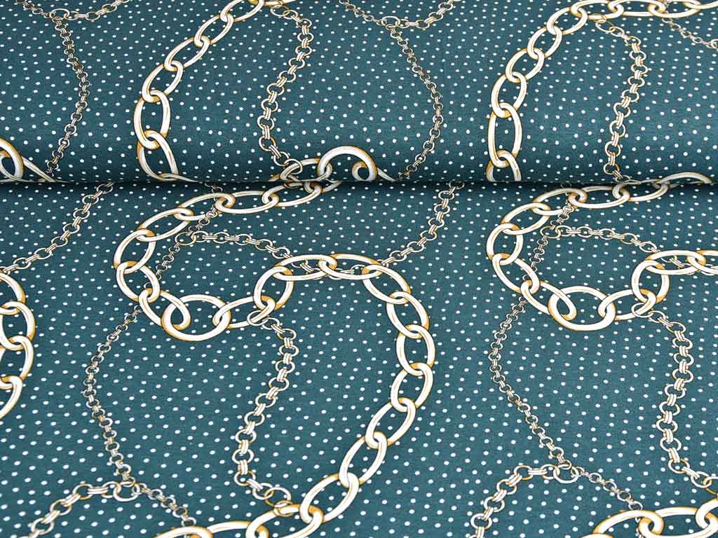 Ein weicher dunkelgrüner Viskosejersey mit einem eleganten Print aus großen und kleinen Gliederketten sowie kleinen Punkten.
