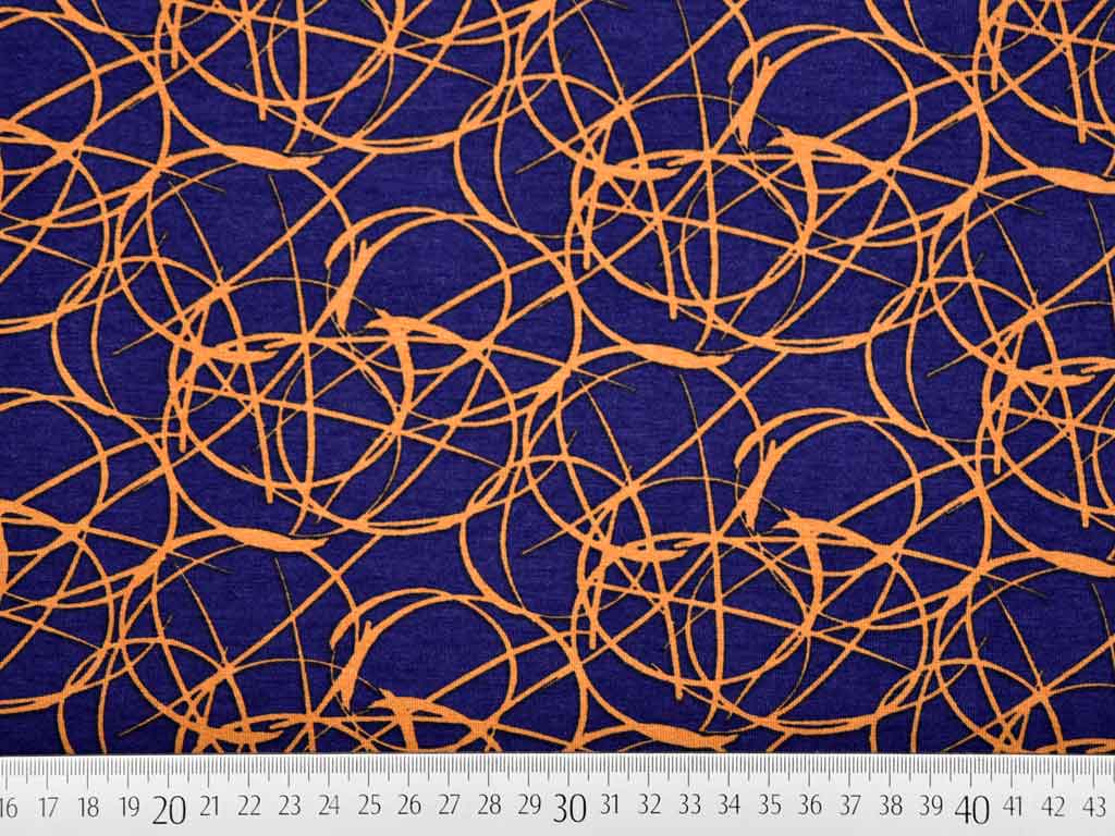 Ein weich und lockerfallender Viskosejersey in dunkelblau mit Kringeln in camel.
