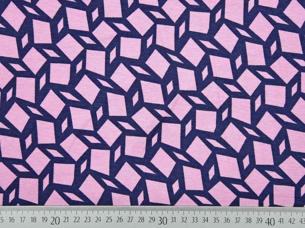 Ein weich fließender Viskosejersey mit grafischem Rauten Muster in dunkelblau und rosa.