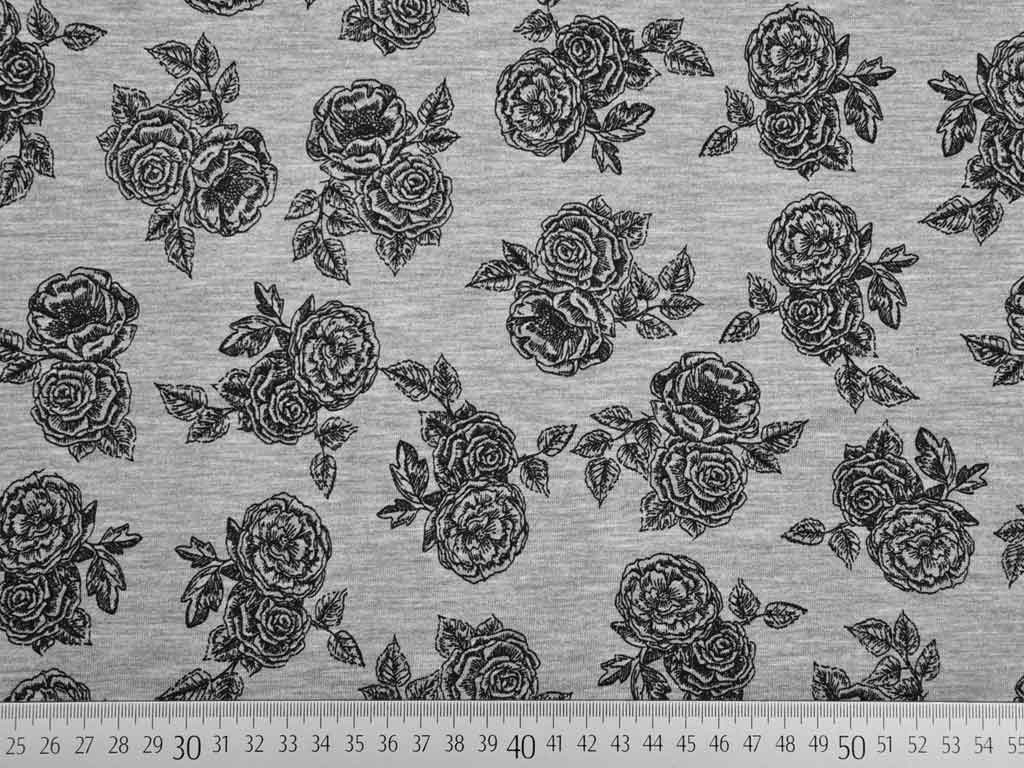 Ein weicher Viskosejersey in grau melange mit schwarzen Rosen.
