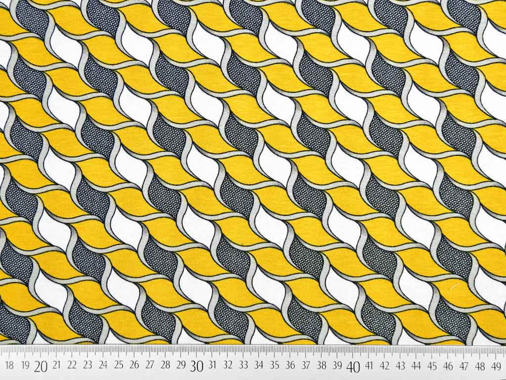 Ein weich fallender Viskosejersey mit grafischem Seilmuster in ocker, grau, weiß und schwarz.