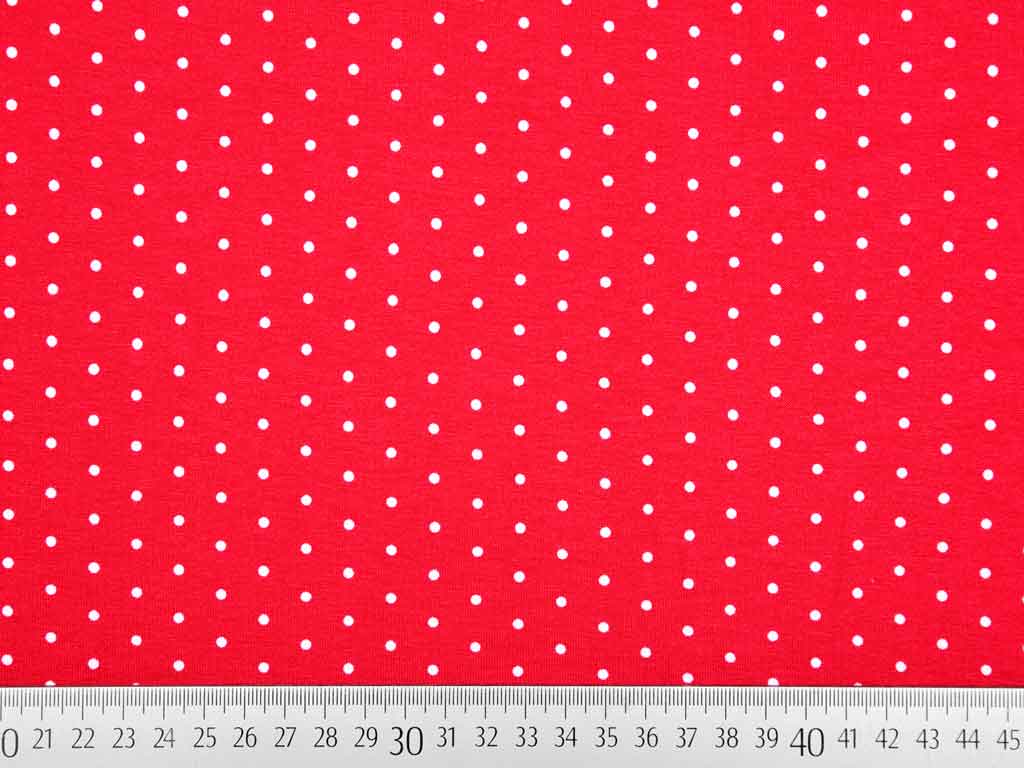 Ein weicher und luftiger, roter Viskosejersey mit kleinen weißen Pünktchen.