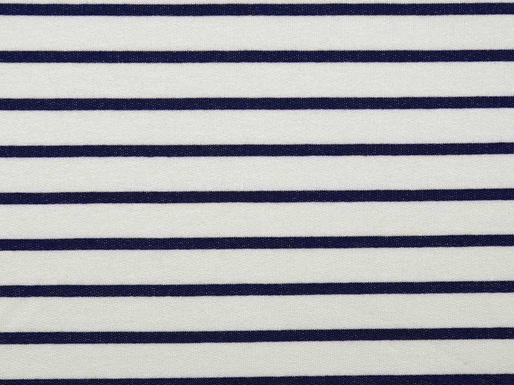 Ein weicher und locker fallender Viskose Streifenjersey aus Italien in dunkelblau und weiß. Die weißen Streifen sind 1,5 cm breit, die dunkelblauen Streifen 0,5 cm. Aufgrund des Elasthan Anteils, dehnt sich der Stoff leicht und bietet hohen Tragekomfort.