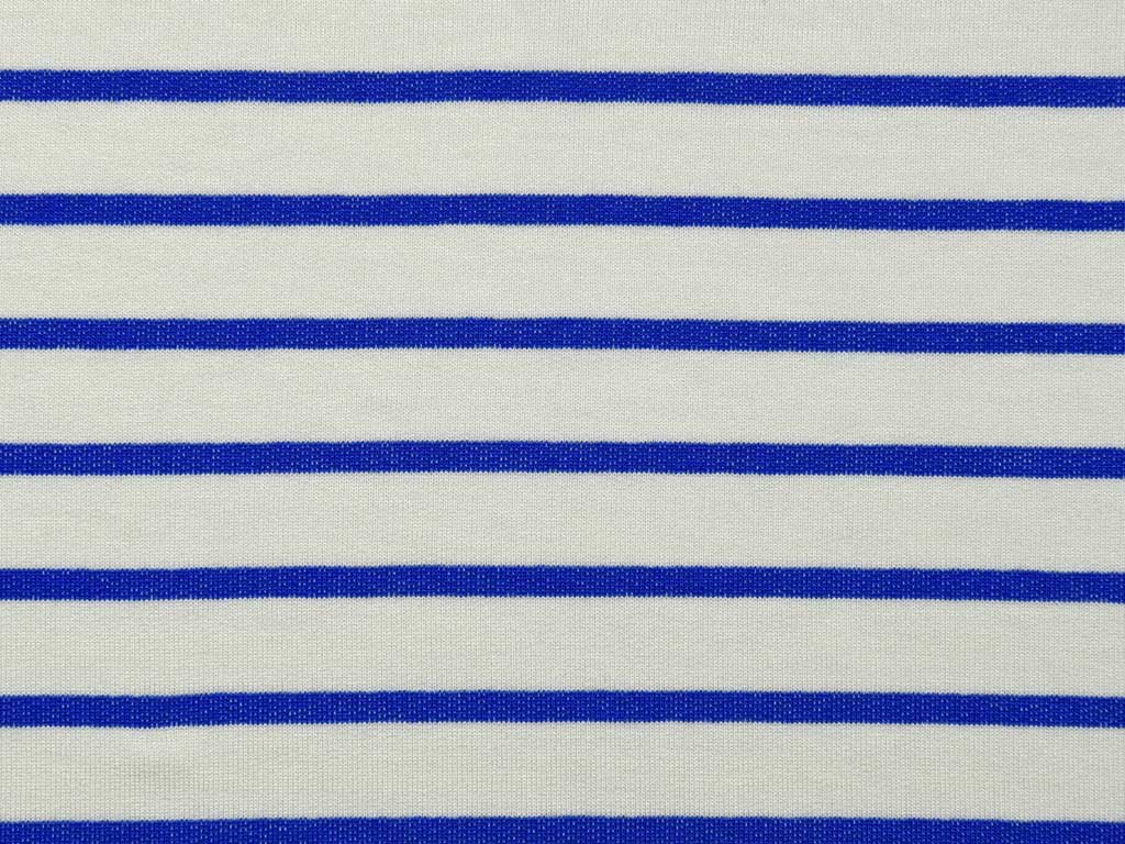Ein weicher und locker fallender Viskose Streifenjersey aus Italien in mittelblau und weiß. Die weißen Streifen sind 1,5 cm breit, die mittelblauen Streifen 0,5 cm. Aufgrund des Elasthan Anteils, dehnt sich der Stoff leicht und bietet hohen Tragekomfort.