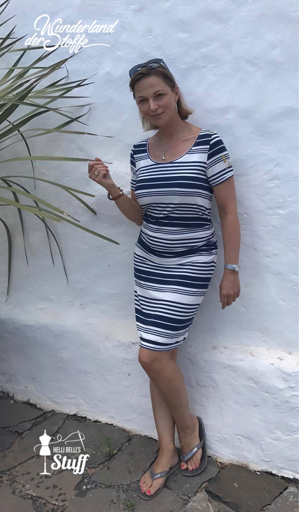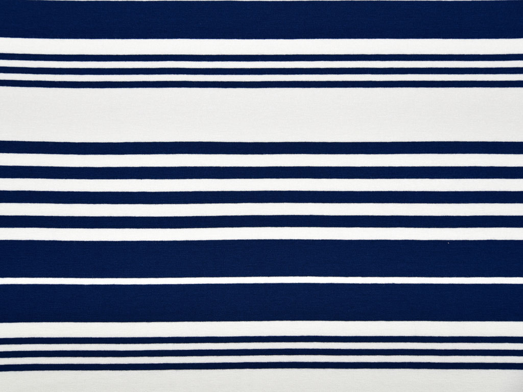 Ein weicher und locker fallender Viskosejersey unterschiedlich breiten Streifen in marine blau und weiß. Aufgrund des Elasthan Anteils dehnt sich der Stoff leicht und bietet hohen Tragekomfort.