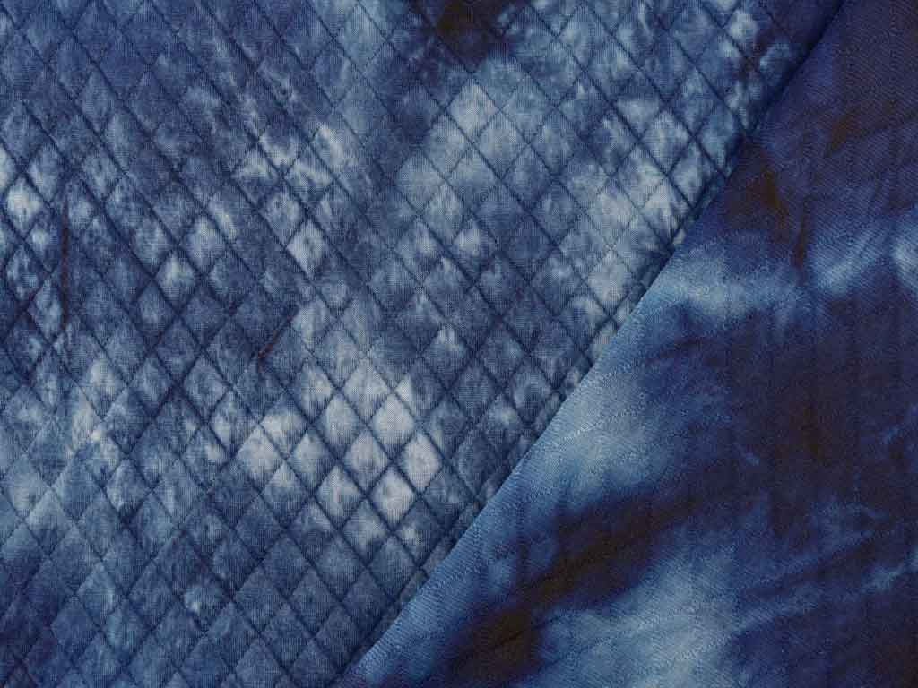Ein dunkelblauer, zweilagiger Jersey im Batiklook, durchgesteppt in Rautenform. Der Stoff hat einen weichen Griff.