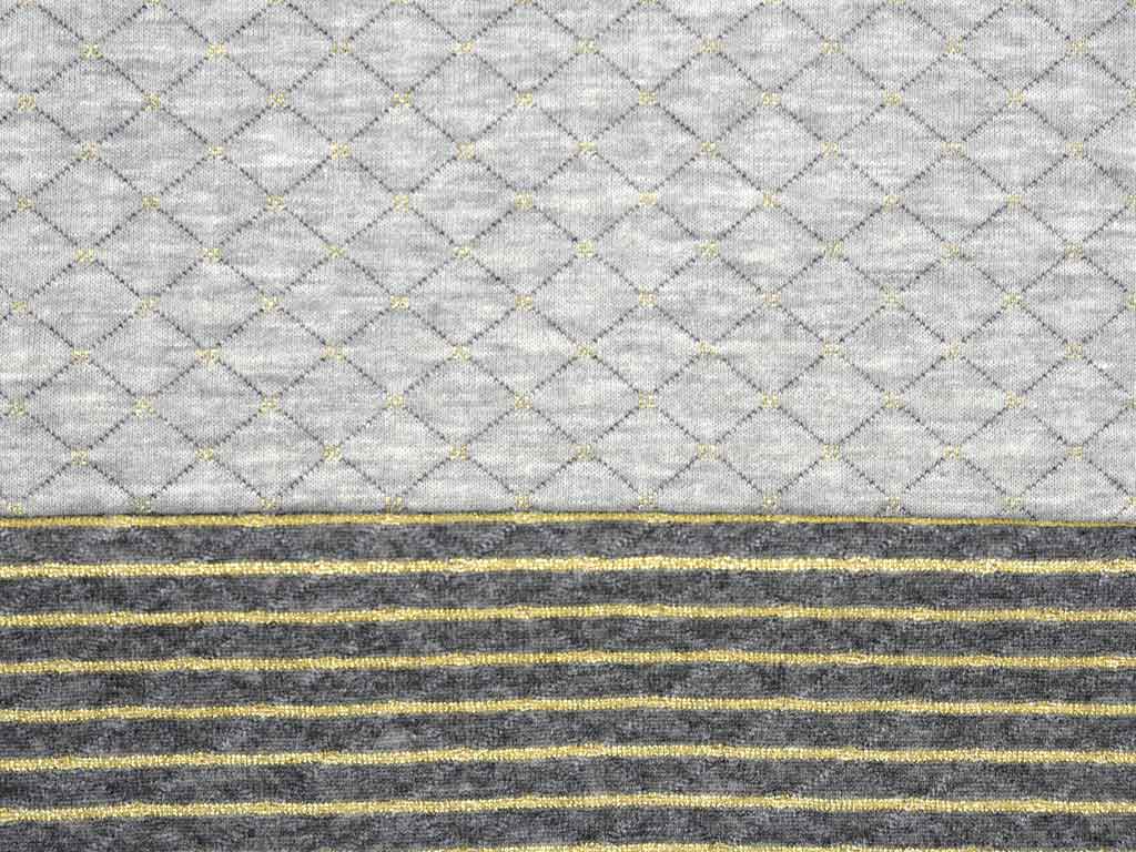 Ein gesteppter Jersey in grau melange mit Rautenmuster und goldenem Glitzerfaden. Die Rückseite ist gold grau gestreift. Beide Seiten können al rechte Seite verwendet werden.