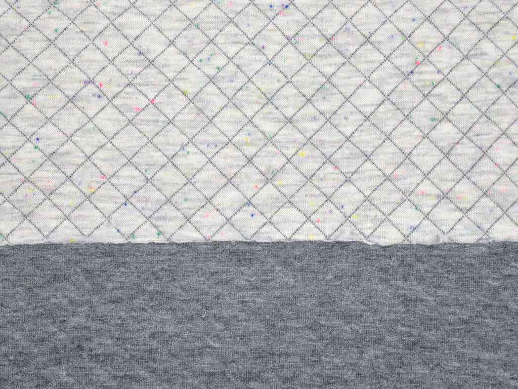 Ein gesteppter Jersey in hellgrau melange mit Rautenmuster und kleinen dezenten bunten Webpunkten.