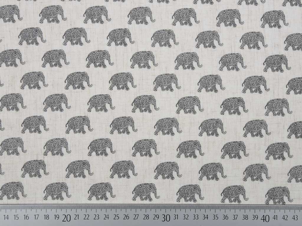 Ein leichter Leinenviskosestoff in ecrue mit grauschwarzen Elefanten.