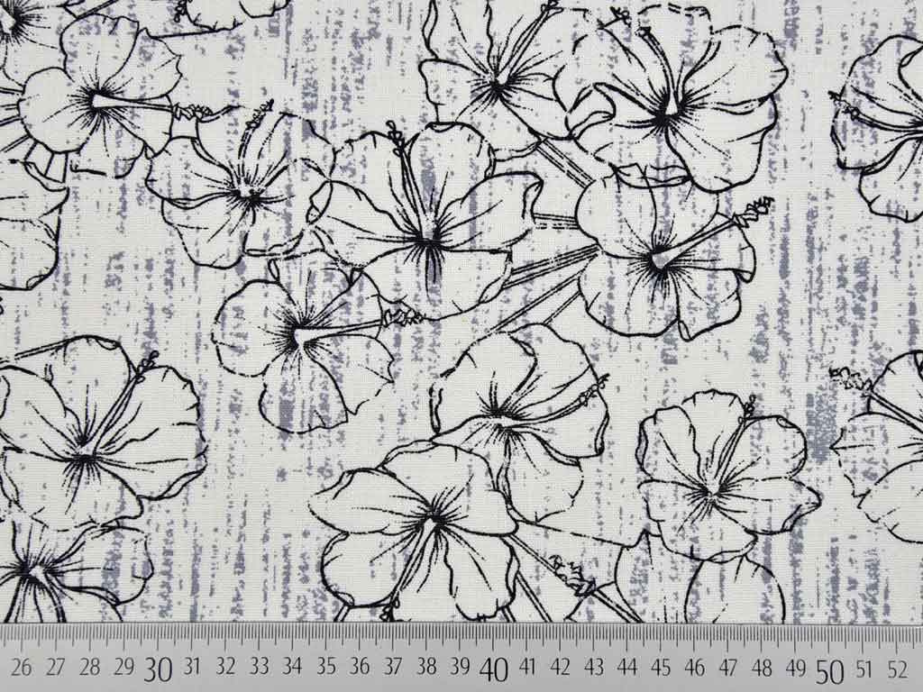 Ein tolles Viskose Leinen Gewebe in cremeweiß mit schwarzen Hibiskus Blüten und unregelässigen Strichen in grau. Weiche Haptik.