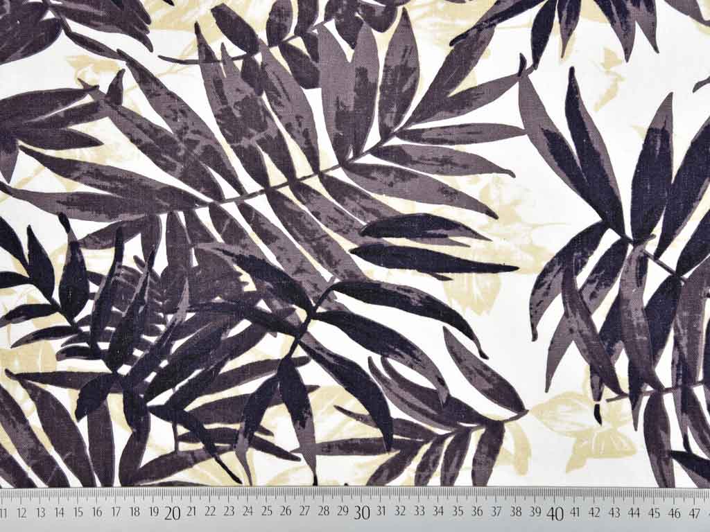 Ein cremeweißer Viskose Leinenstoff mit großen Palmblättern, die in verschiedenen Brauntönen schattiert sind. Die hellbeigen Blätter liegen im Hintergrund. Aufgrund des Viskoseanteils hat der Stoff einen weichen Griff und knittert nicht so stark wie reines Leinen.