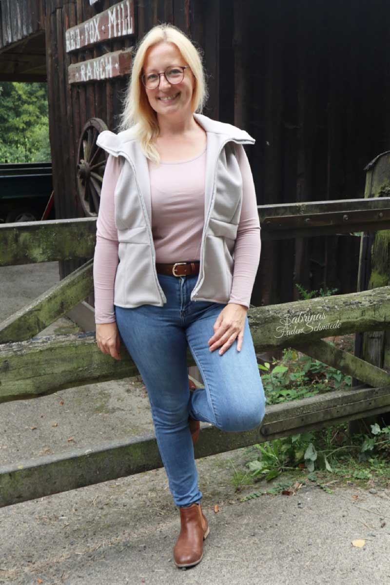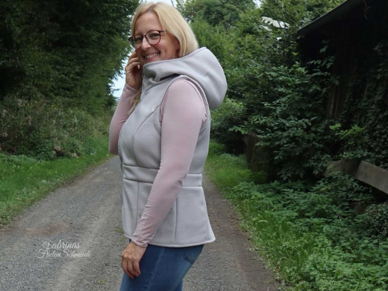 Ein eleganter Doublefacestoff auf der einen Seite ein angerauter Velourähnlicher Jackenstoff mit wolliger Haptik und auf der anderen Seite Strick hier in hellgrau.
