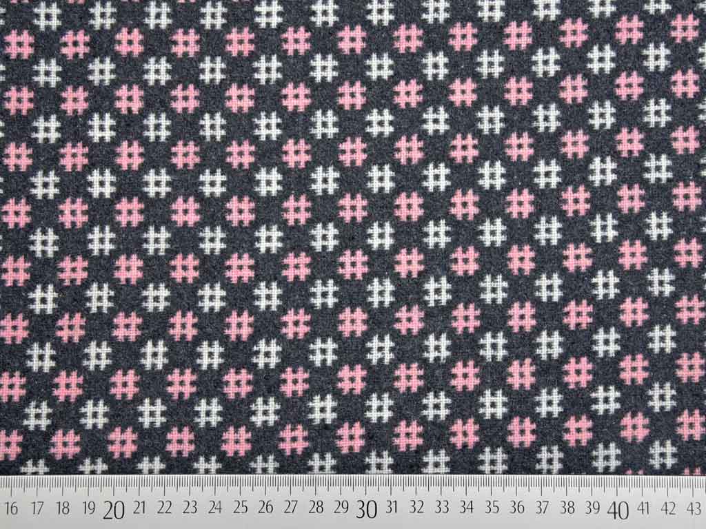 Ein mitteldicker Wollstoff in anthrazit mit rosa Rautenzeichen (Hashtags). Die Oberfläche ist leicht angeraut und hat somit eine weiche, wollige Haptik. Die Rückseite kann ebenfalls als rechte Seite verwendet werden, die Farbstellung ist dort genau umgekehrt. Die Oberfäche der Rückseite ist nicht angeraut und fühlt sich an wie normale Webware.