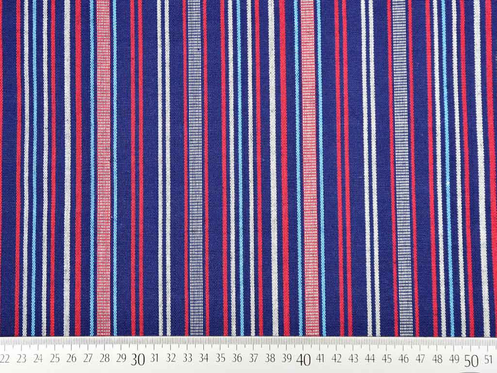 Ein dickerer Stoff, dennoch weich im Griff, mit verschieden breiten Streifen in dunkelblau, rot und weiß.