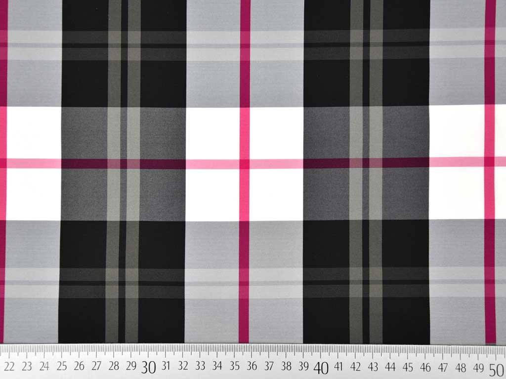 Ein trendiger, leichter Karostoff in beere schwarz weiss kariert. Der Stoff hat eine glatte Oberfläche und ist weich im Griff.