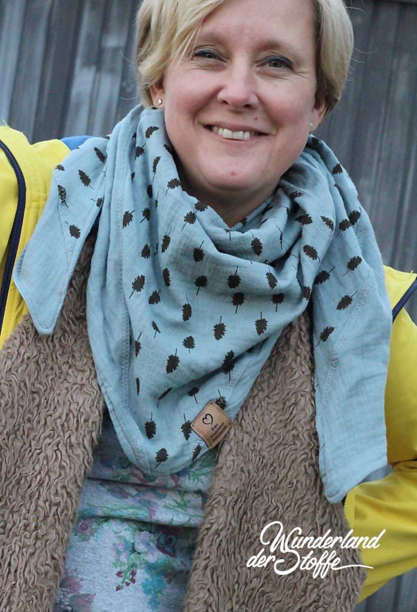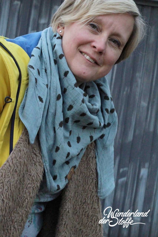 DER angesagte Stoffe der Saison: Double Gauze!! Die Modewelt hat diesen Stoff neu entdeckt und so werden nicht mehr nur Spucktücher und Windeln daraus genäht, sondern modische Fashion Teile! Hier als weicher Double Gauze in grüngrau mit khaki farbenen Bäumchen.