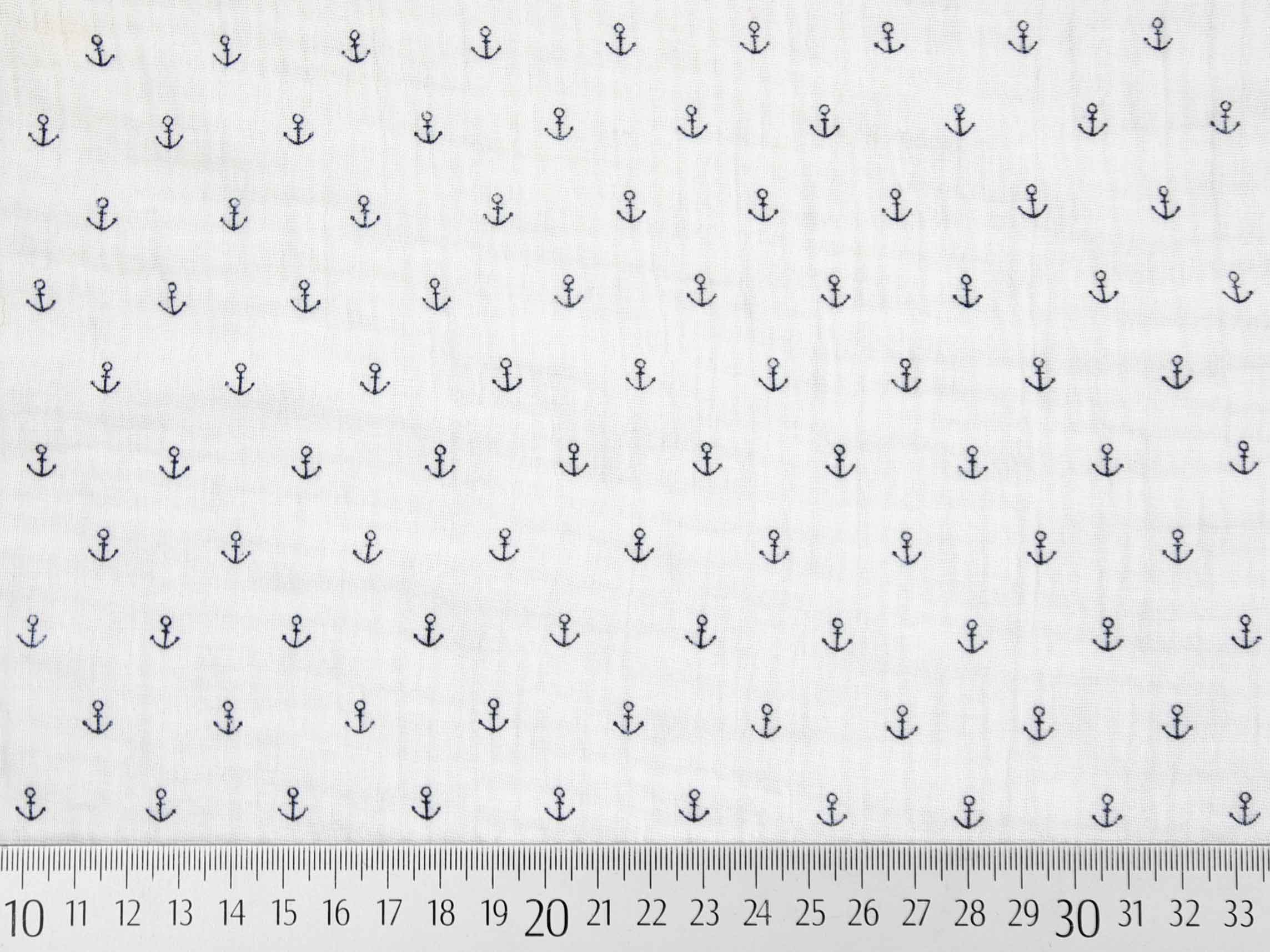Ein weicher und luftiger weißer Musselin (Double Gauze) mit kleinen dunkelblauen Ankern.