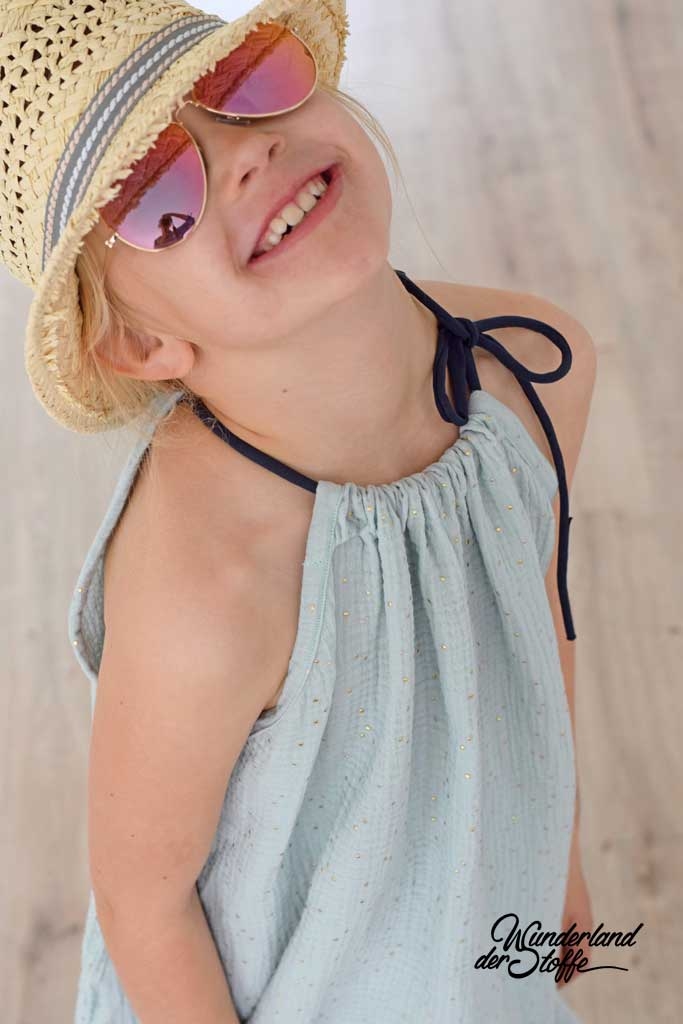 DER angesagte Stoffe der Saison: Double Gauze!! Die Modewelt hat diesen Stoff neu entdeckt und so werden nicht mehr nur Spucktücher und Windeln daraus genäht, sondern modische Fashion Teile! Hier als weicher und luftiger mintfarbener Musselin (Double Gauze) mit kleinen goldenen Punkten.Die Pünktchen sind 3 mm groß.
