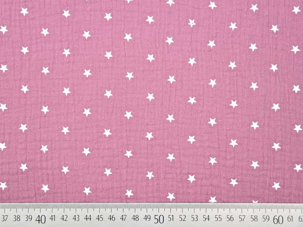 DER angesagte Stoffe der Saison: Musselin!! Die Modewelt hat diesen Stoff neu entdeckt und so werden nicht mehr nur Spucktücher und Windeln daraus genäht, sondern modische Fashion Teile! Hier als weicher Musselin in dunklem Altrosa mit kleinen weißen Sternen.