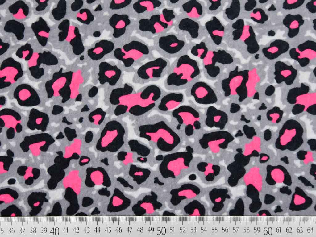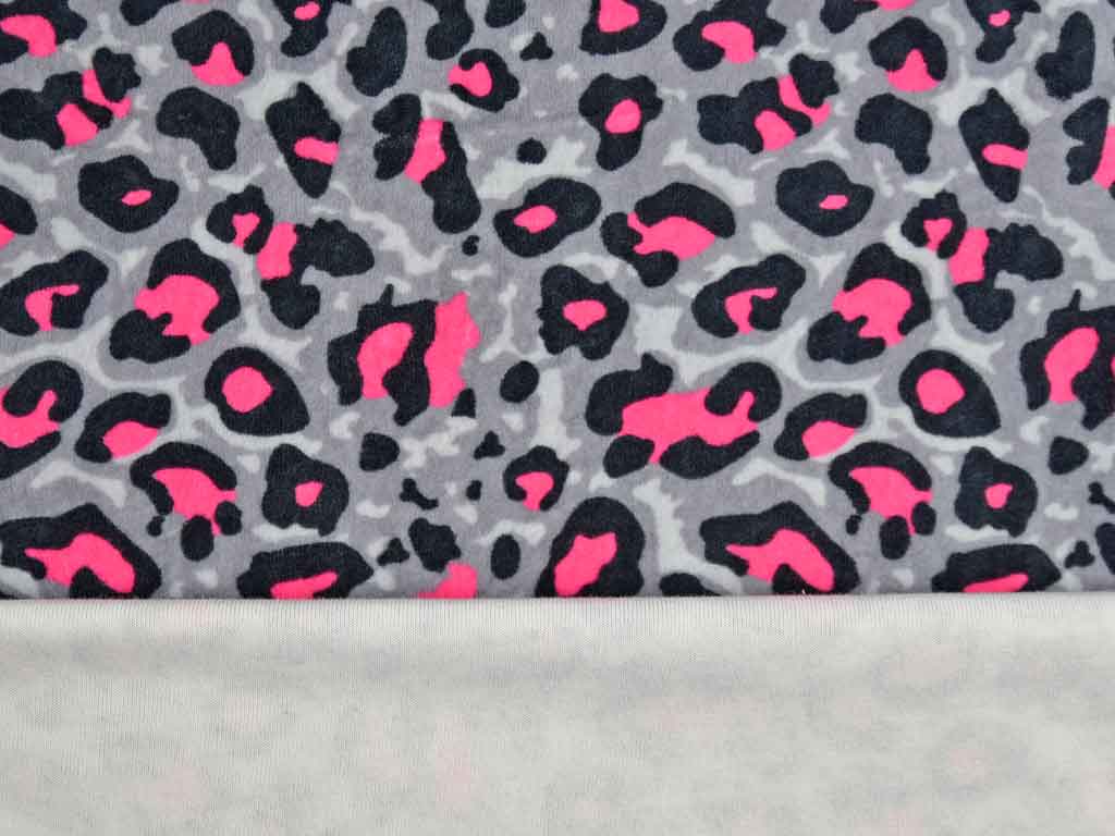 Ein kuschelig weicher Nicki Stoff mit schwarz-grauem Leopardenmuster und neonpinken Farbflecken.
