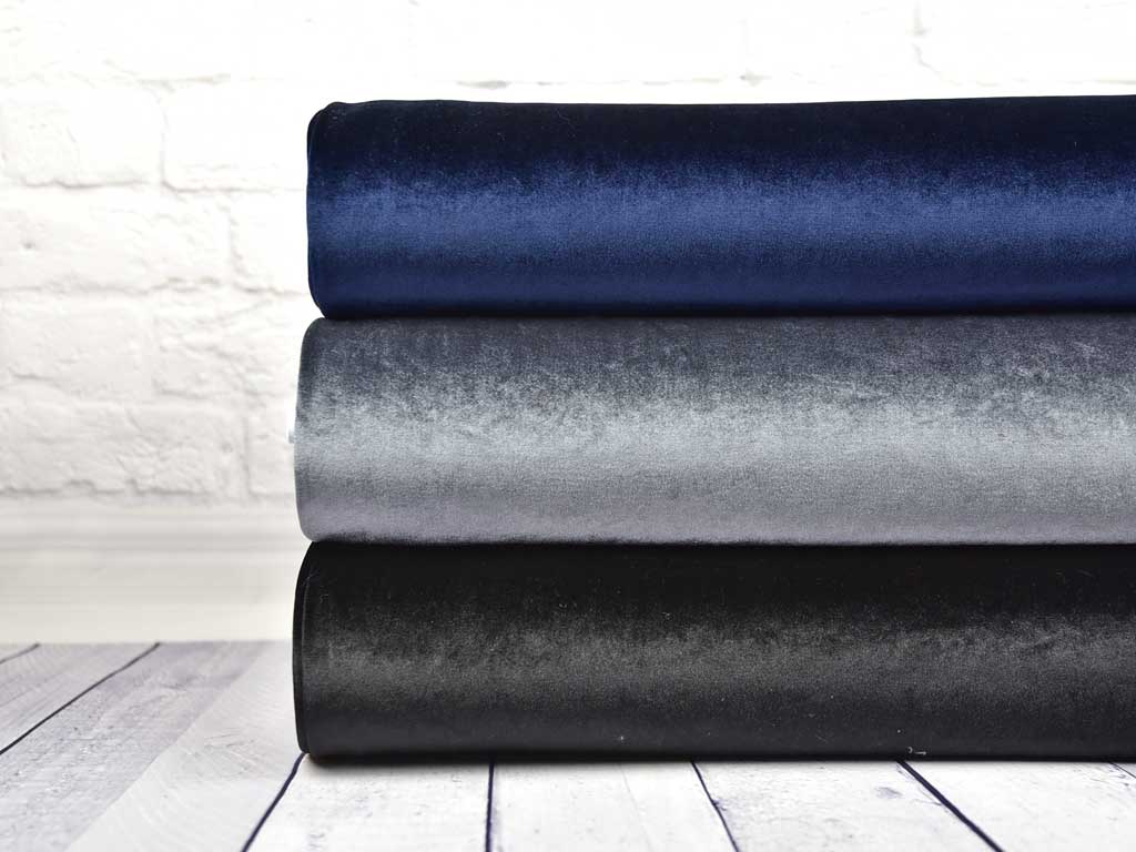 Ein weicher, elastischer Samtjersey in dunkelgrau. Wie bei Samt üblich hat der Stoff einen Strich.