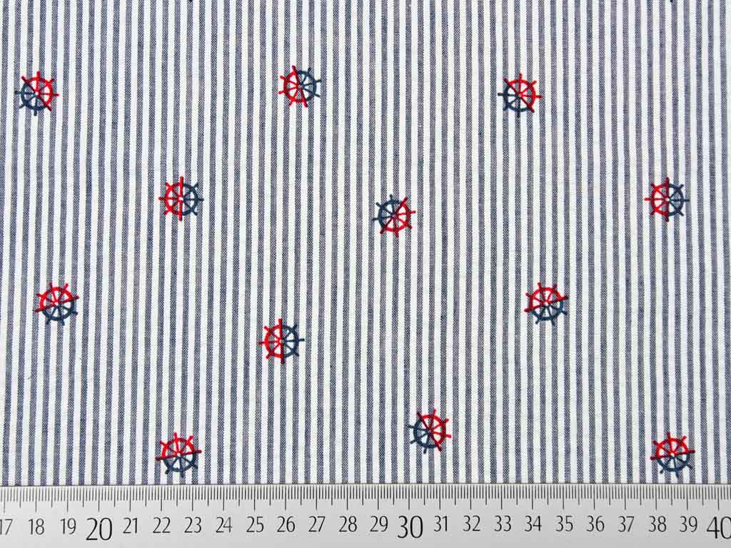 Ein toller Seersucker aus 100% Baumwolle mit blaugrau-weißen Streifen bedruckt mit kleinen Steuerrädern.