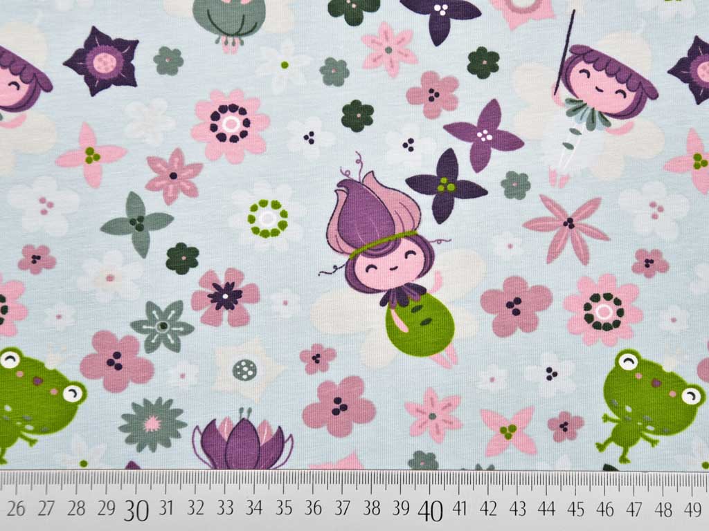 Ein weicher Baumwolljersey in hellmint mit Waldmännchen und verschiedenen Blumen in altrosa, dunkelmint, lila, und Pflaume sowie grünen Froschen.