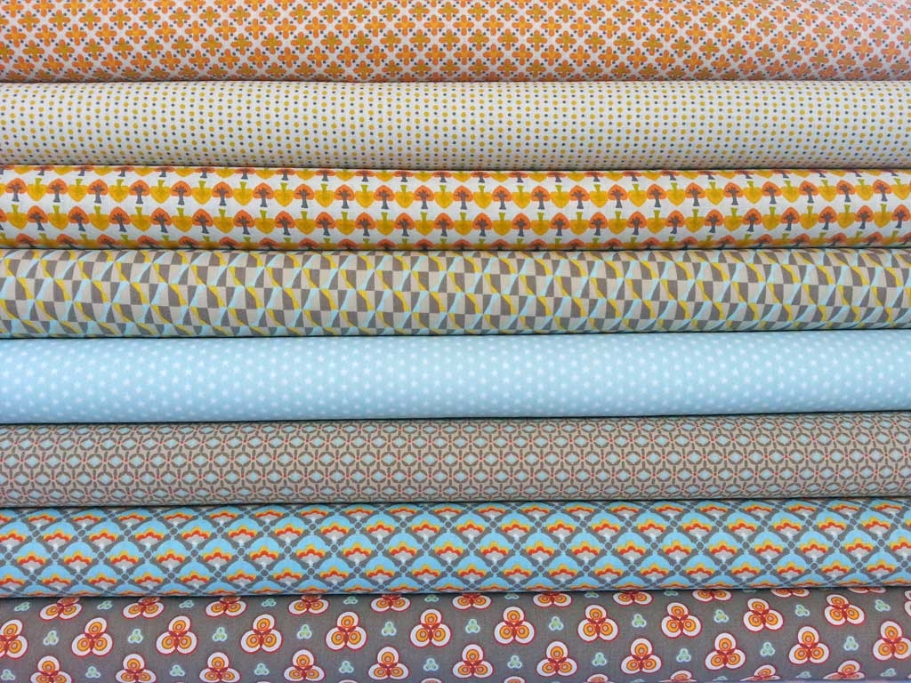 Ein wunderschöner Baumwollpopelin aus der Serie Sew me Up von der Designerin Poppy in hellgrau mit gelben und orange-farbenen Bäumchen.