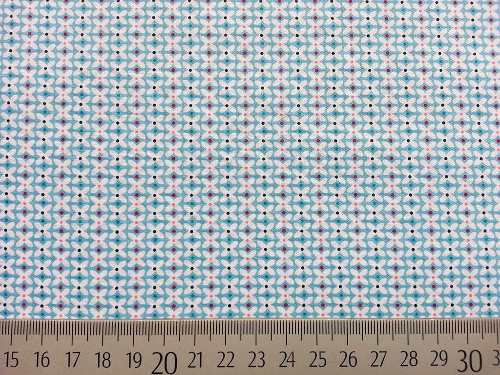 Ein weicher und sehr glatter Baumwollstoff in hellblau mit kleinen Kreuzen und Punkten als Zopfmuster u.a. in lachs (rosa), petrol, weiß.