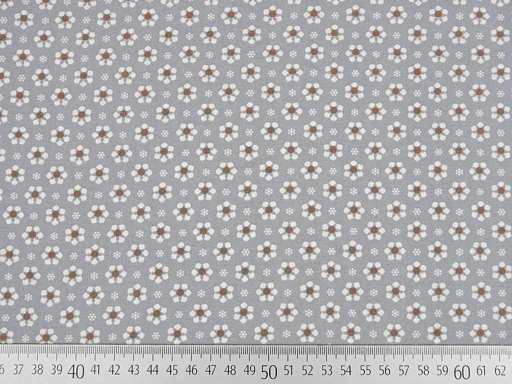 Ein hellgrauer Baumwollstoff mit kleinen, braun-weißen Blümchen. Die Webware hat eine weiche Haptik und eine glatte Oberfläche.