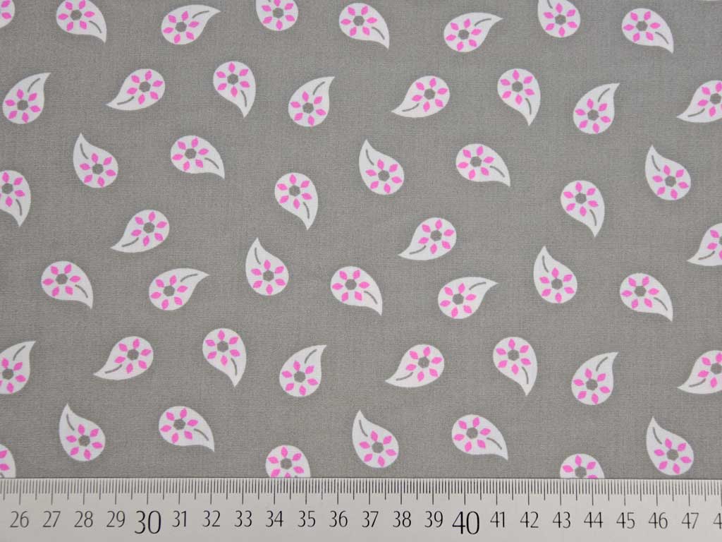 Ein weicher, glatter Baumwollstoff in taupe mit kleinem Paisleymuster in rosa und weiß.