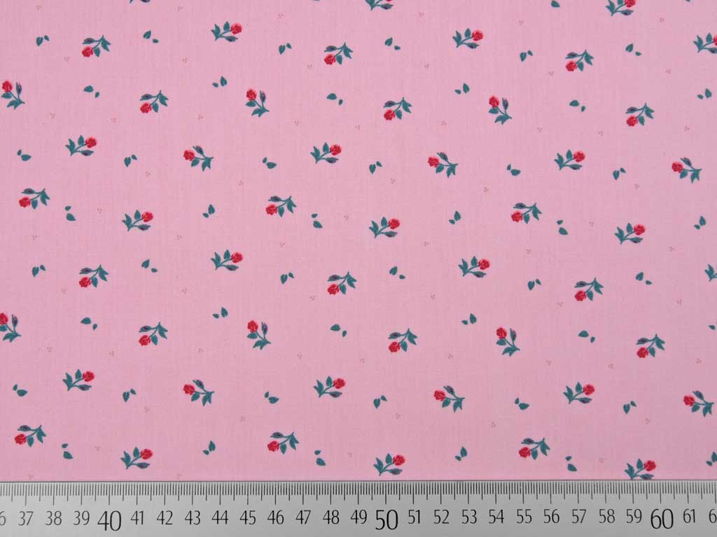 Ein weicher, glatter Baumwollstoff in rosa mit kleinen, roten Rosen und petrolfarbenen Blättern.