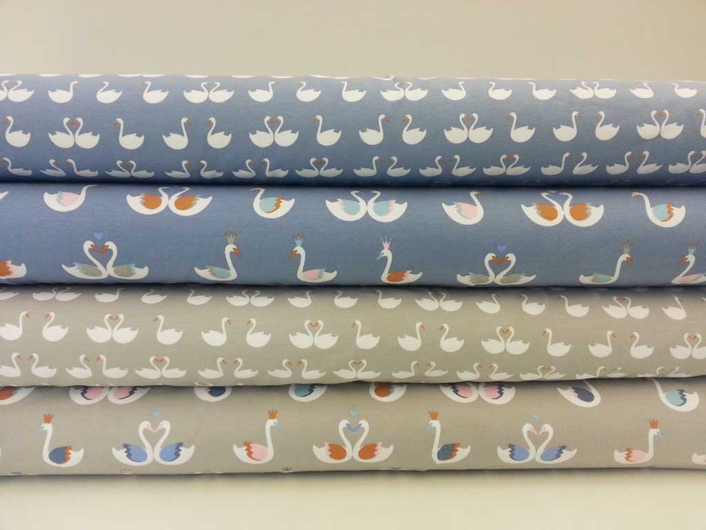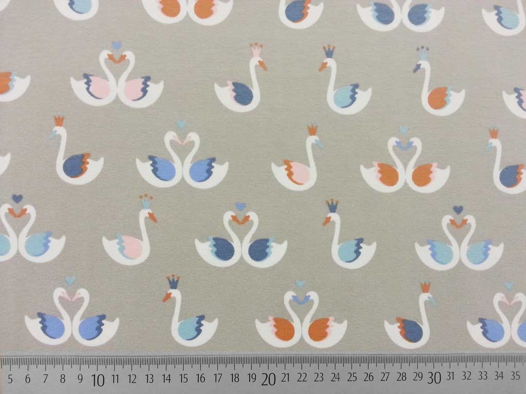 Ein wunderschöner Jersey in hellgrau mit süßen Schwänen mit Kronen und Herzen.