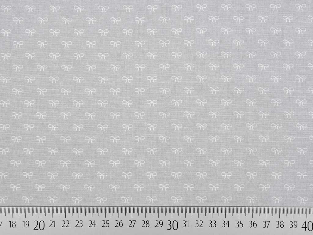 Aus der Serie "Sweeties" ein glatter Baumwollstoff in hellgrau mit kleinen weißen Schleifchen.