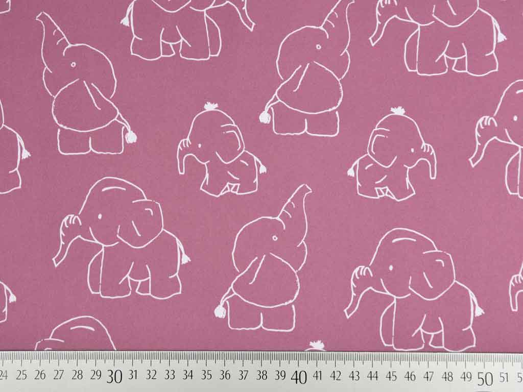Ein wind- und wasserabweisender, dunkel altrosa Softshell Jackenstoff bedruckt mit weißen Elefanten Konturen. Die Rückseite ist aus altrosa Fleece. Aufgrund des Elasthan Anteils ist der Stoff leicht elastisch und bietet somit einen guten Tragekomfort.
