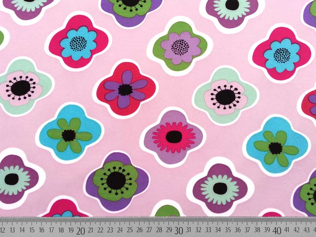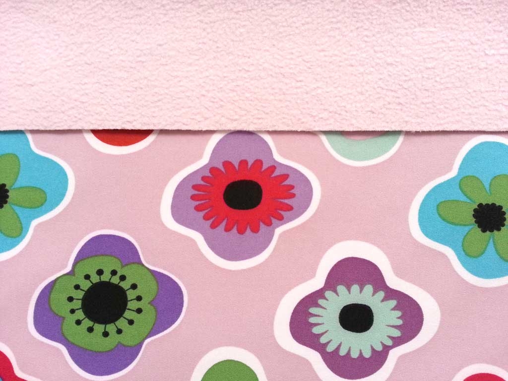 Ein toller wind- und wasserabweisender Softshellstoff in altrosa mit bunten Retroblüten. Die Rückseite ist aus rosa Fleece.