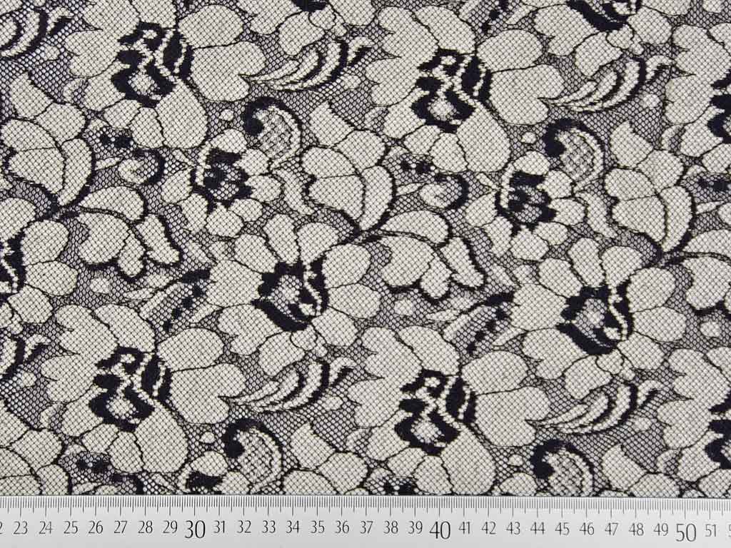 Ein wunderschöne Spitze mit Blumenmuster in schwarz und ecrue. Die Spitze ist weich und leicht elastisch.