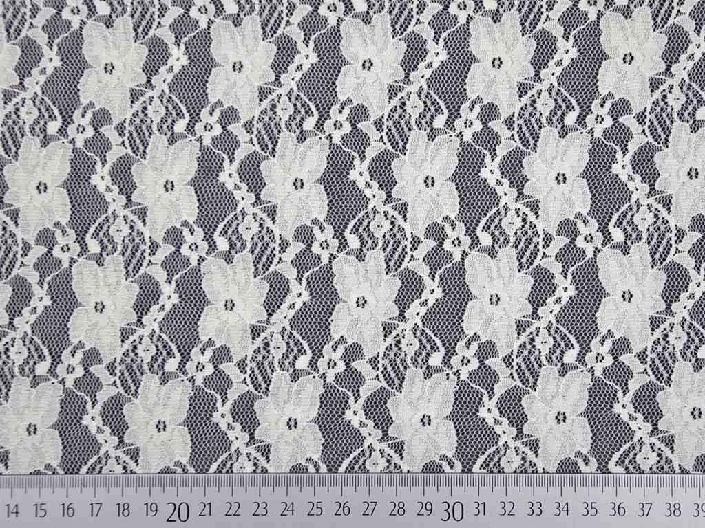 Eine cremeweiße Spitze als Meterware mit Blumenmuster. Die Spitze ist weich und leicht elastisch.