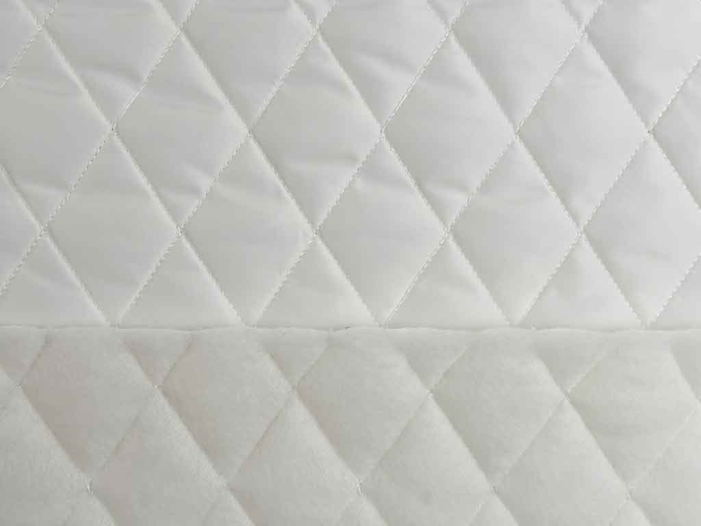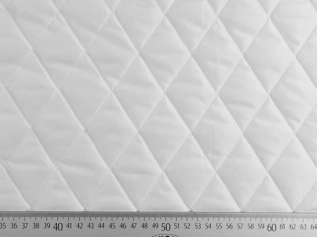 Ein wattierter, cremeweißer Jackenstoff. Der Steppstoff ist mit weißem, leichten Volumenvlies abgefüttert und in Rauten durchgesteppt.