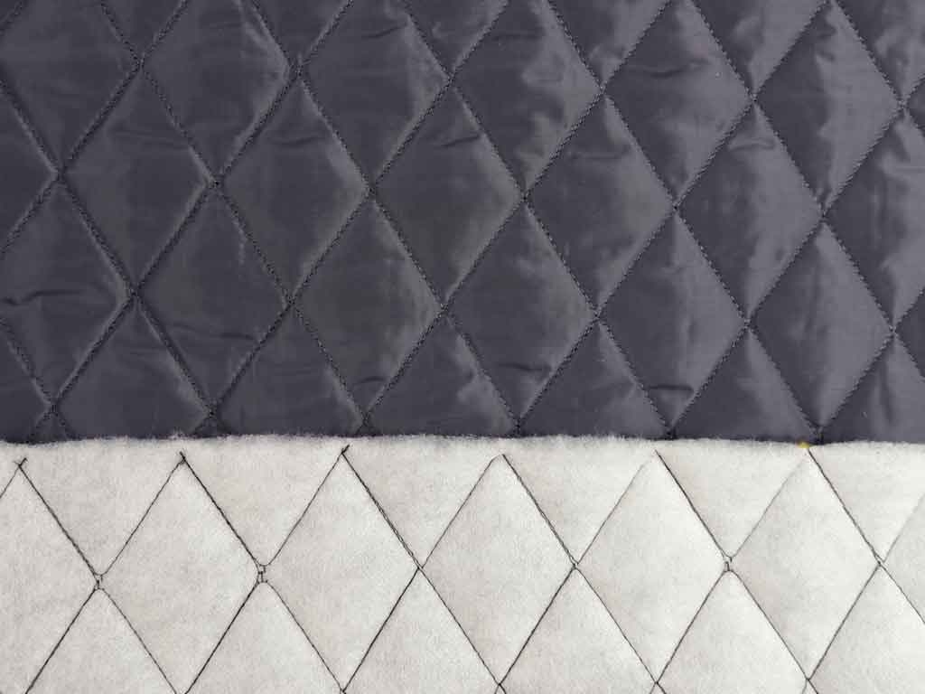 Ein wattierter, dunkelgrauer (anthrazit) Jackenstoff. Der Steppstoff ist mit weißem, leichten Volumenvlies abgefüttert und in Rauten durchgesteppt.