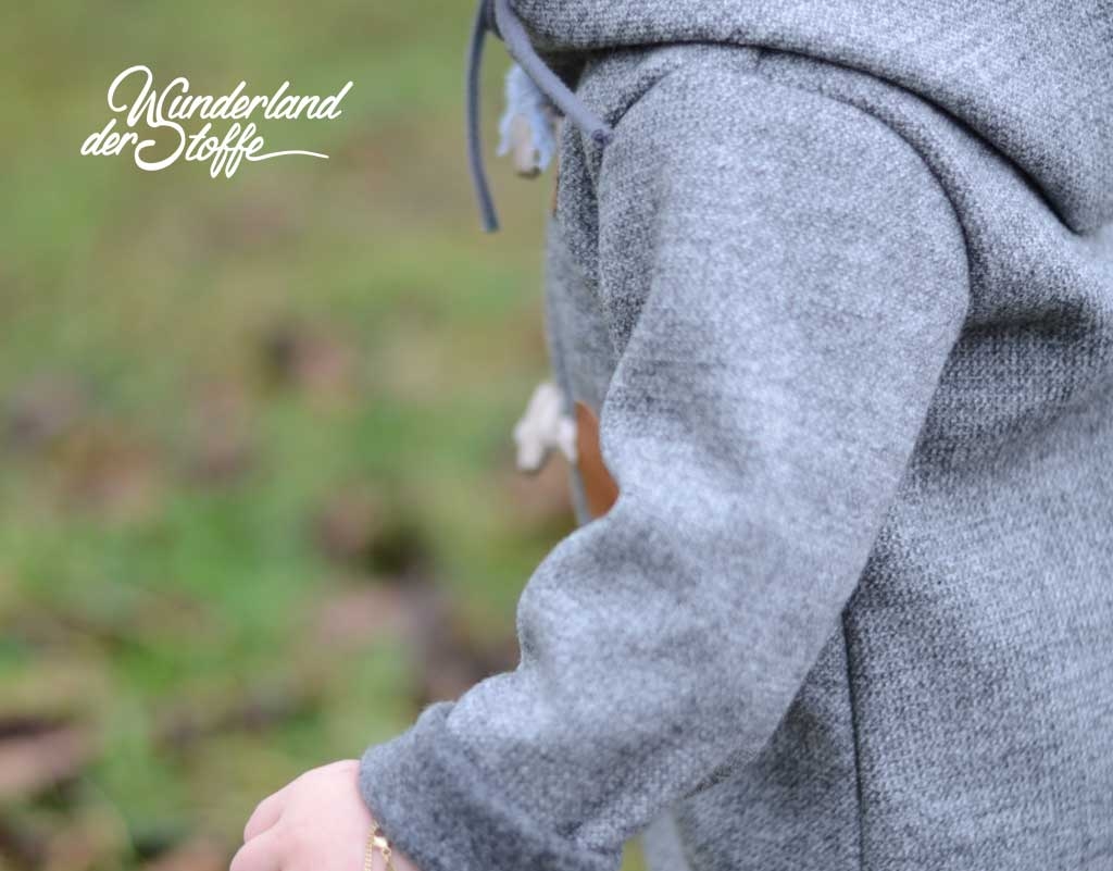Ein eleganter, anthrazit melierter Doublefacestoff, der auf der einen Seite ein angerauter velourähnlicher Jackenstoff mit wolliger Haptik ist und auf der anderen Seite Strick.