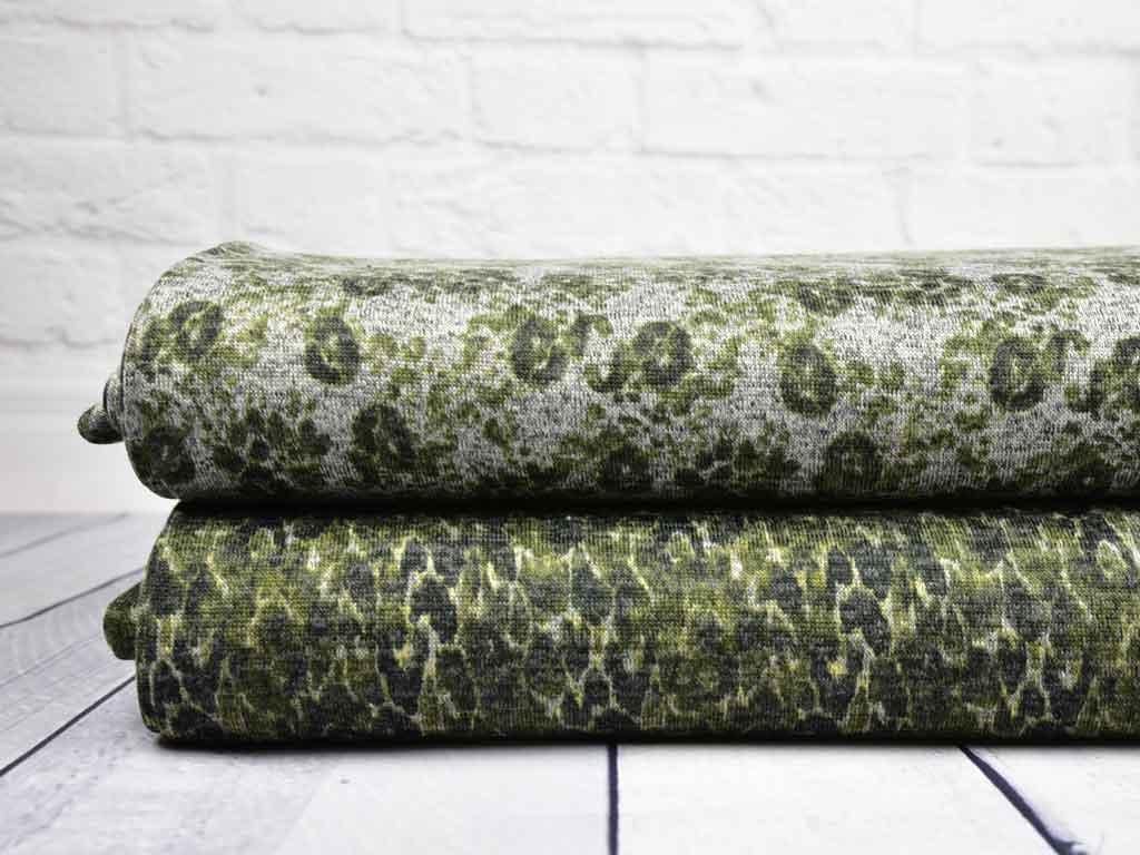 Ein ganz weicher Feinstrick in hellgrau meliert mit filgranem Leopardenmuster und niedlichen Tatzenabdrücken in beige und grün.
