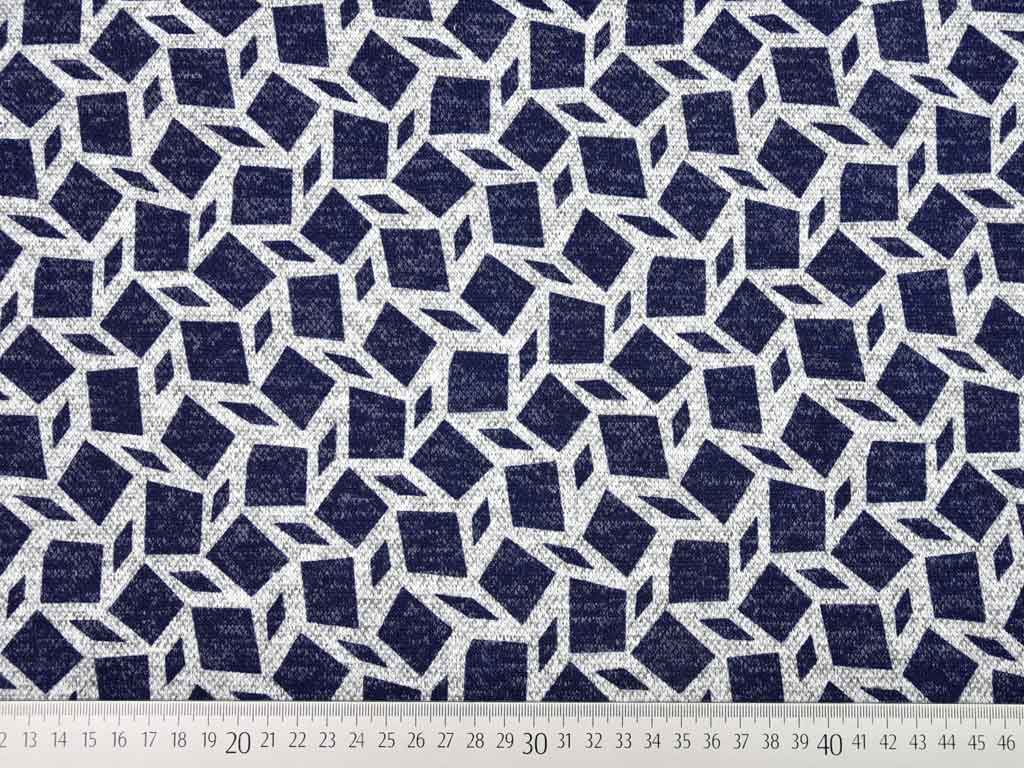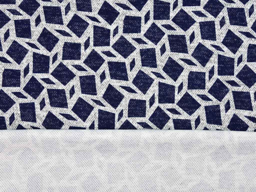 Ein melierter Strickjersey in grau melange mit grafischem Rautenmuster in dunkelblau. Der Stoff ist weich im Griff, trotzdem stabil und elastisch.