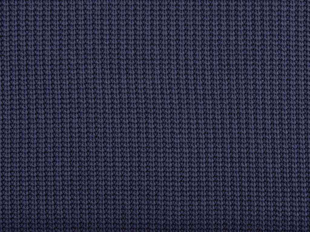 Ein dunkelblauer Strickstoff aus Baumwolle mit Rippenmuster. Dieser gestrickte Baumwollstoff fällt weich und kratzt nicht.