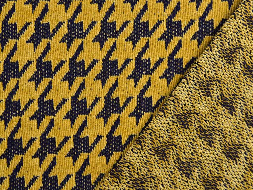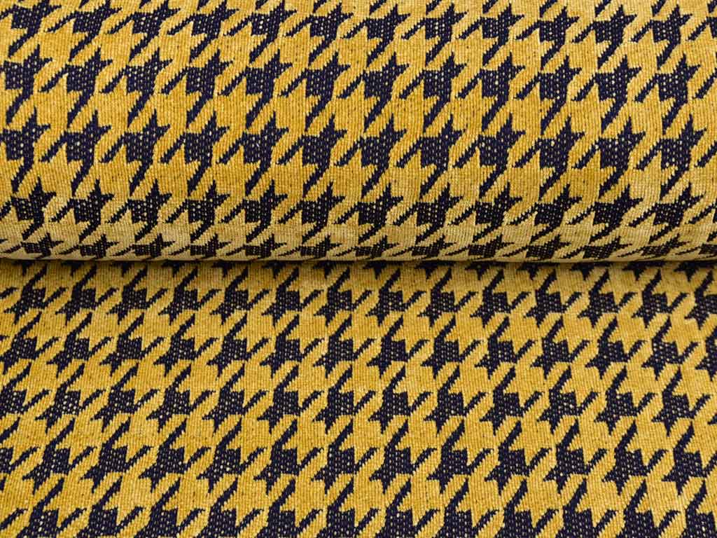 Ein ockerfarbener Strickstoff aus Chenille mit schwarzem Hahnentrittmuster. Die samtartige Oberfläche ist kuschelig weich.