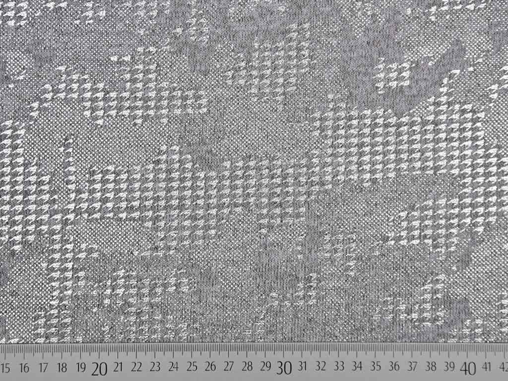 Ein weicher Strickstoff in hellgrau melange bedruckt mit silberfarbigem Hahnentrittmuster.